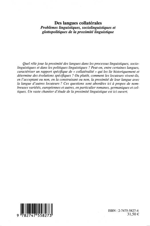 Quel rôle joue la proximité des langues dans les processus linguistiques, sociolinguistiques et dans les politiques linguistiques ? Peut-on, entre certaines langues, caractériser un rapport spécifique de "collatéralité" qui les lie historiquement et détermine des évolutions spécifiques ? Ou plutôt, comment les locuteurs vivent-ils, en l'acceptant ou non, en la construisant ou non, la proximité de leur langue avec la langue d'autres locuteurs ? Ces questions sont abordées ici à propos de nombreuses variétés, européennes et autres, en particulier romanes, germaniques et celtiques.