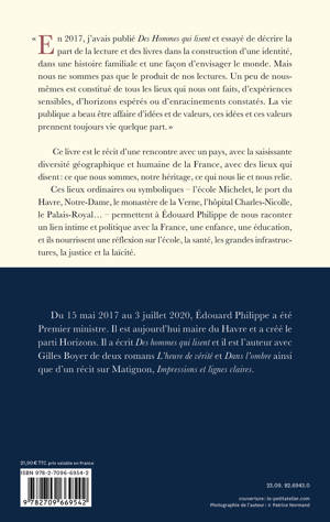 Ce livre est le récit d’une rencontre avec un pays, avec la saisissante diversité géographique et humaine de la France, avec des lieux qui disent : ce que nous sommes, notre héritage, ce qui nous lie et nous relie. Ces lieux ordinaires ou symboliques - l’école Michelet, le port du Havre, Notre-Dame, le monastère de la Verne, l’hôpital Charles Nicolle, le Palais Royal… - permettent à Édouard Philippe de nous raconter un lien intime et politique avec la France, une enfance, une éducation et ils nourrissent une réflexion sur l’école, la santé, les grandes infrastructures, la justice et la laïcité.