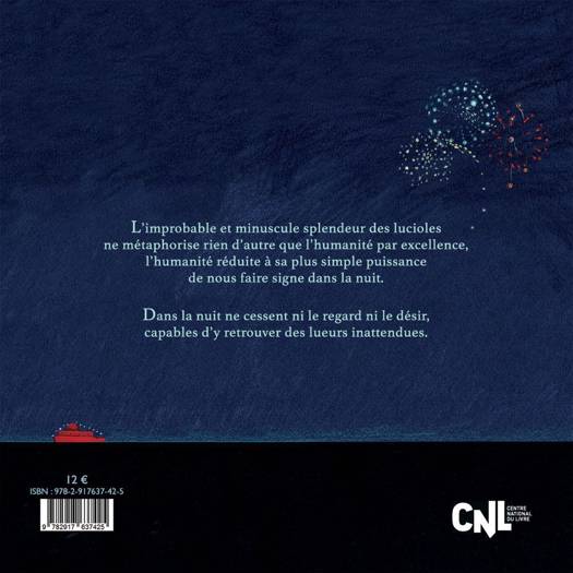 Au coeur de la nuit, Georges Didi-Huberman nous encourage à chercher les lumières, fussent-elle aussi minuscules et fragiles que les lucioles. Il nous invite à les partager et à devenir lucioles nous même, porteurs de lumière et d'actes libres. C'est un message généreux et fou, une source d'espoir, un chemin de vie tracé avec la délicatesse du poète, la clairvoyance du philosophe, la conviction du militant. L'auteur est édité pour la première fois en jeunesse et c'est un événement ! Les couleurs vives, de pastels et d'encres, d'Amélie Jackowski, contrastent avec les horizons marines et noirs. Elle nous donne à sentir la profondeur de la nuit et le petit miracle des lucioles. Certes les dangers existent au coeur des ténèbres, mais la connaissance, la fraternité, la confiance... sont autant de résistances face à l'ignorance et à la peur. Il faut le donner à entendre et le répéter !
