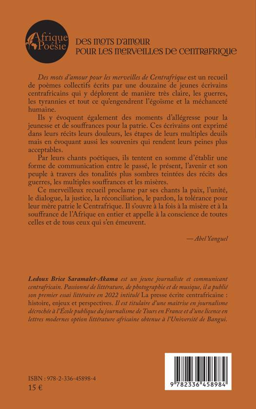 Des mots d'amour pour les merveilles de Centrafrique est un recueil de poèmes collectifs écrits par une douzaine de jeunes écrivains centrafricains qui y déplorent de manière très claire, les guerres, les tyrannies et tout ce qu'engendrent l'égoïsme et la méchanceté humaine. Ils y évoquent également des moments d'allégresse pour la jeunesse et de souffrances pour la patrie. Ces écrivains ont exprimé dans leurs récits leurs douleurs, les étapes de leurs multiples deuils mais en évoquant aussi les souvenirs qui rendent leurs peines plus acceptables. Par leurs chants poétiques, ils tentent en somme d'établir une forme de communication entre le passé, le présent, l'avenir et son peuple à travers des tonalités plus sombres teintées des récits des guerres, les multiples souffrances et les misères. Ce merveilleux recueil proclame par ses chants la paix, l'unité, le dialogue, la justice, la réconciliation, le pardon, la tolérance pour leur mère patrie le Centrafrique. Il s'ouvre à la fois à la misère et à la souffrance de l'Afrique en entier et appelle à la conscience de toutes celles et de tous ceux qui s'en émeuvent.