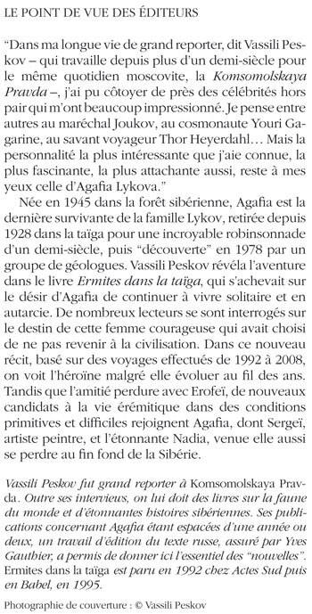 «Vassili Peskov fut grand reporter à Komsomolskaya Pravda. Outre ses interviews, on lui doit des livres sur la faune du monde et d'étonnantes histoires sibériennes. Ses publications concernant Agafi a étant espacées d'une année ou deux, un travail d'édition du texte russe, assuré par Yves Gauthier, a permis de donner ici l'essentiel des "nouvelles". »Ermites dans la taïga« est paru en 1992 chez Actes Sud puis en Babel, en 1995.»