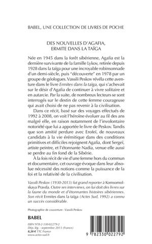 Dans ce récit, basé sur des voyages effectués de 1992 à 2008, on voit l'héroïne évoluer au fil des ans malgré elle, en raison notamment de l'involontaire notoriété que lui a apportée le livre de Peskov. Tandis que son amitié perdure avec Erofeï, de nouveaux candidats à la vie érémitique dans des conditions primitives et difficiles rejoignent Agafia, dont Sergeï, artiste peintre, et l'étonnante Nadia, venue elle aussi se perdre au fin fond de la Sibérie.