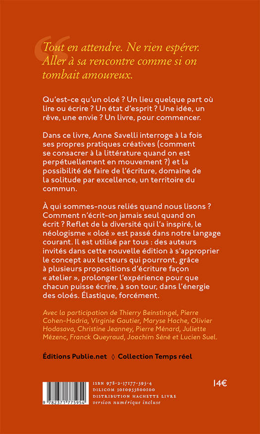 « Tout en attendre. Ne rien espérer. Aller à sa rencontre comme si on tombait amoureux. » Qu'est-ce qu'un oloé ? Un lieu quelque part où lire ou écrire ? Un état d'esprit ? Une idée, un rêve, une envie ? Un livre, pour commencer. Dans ce livre, Anne Savelli interroge à la fois ses propres pratiques créatives (comment se consacrer à la littérature quand on est perpétuellement en mouvement ? ) et la possibilité de faire de l'écriture, domaine de la solitude par excellence, un territoire du commun. À qui sommes-nous reliés quand nous lisons ? Comment n'écrit-on jamais seul quand on écrit ? Reflet de la diversité qui l'a inspiré, le néologisme "oloé" est passé dans notre langage courant. Il est utilisé par tous : des auteurs invités dans cette nouvelle édition à s'approprier le concept aux lecteurs qui pourront, grâce à plusieurs propositions d'écriture façon "atelier", prolonger l'expérience pour que chacun puisse écrire, à son tour, dans l'énergie des oloés. Élastique, forcément. Avec la participation de Thierry Beinstingel, Pierre Cohen-Hadria, Virginie Gautier, Maryse Hache, Olivier Hodasava, Christine Jeanney, Pierre Ménard, Juliette Mézenc, Franck Queyraud, Joachim Séné et Lucien Suel.