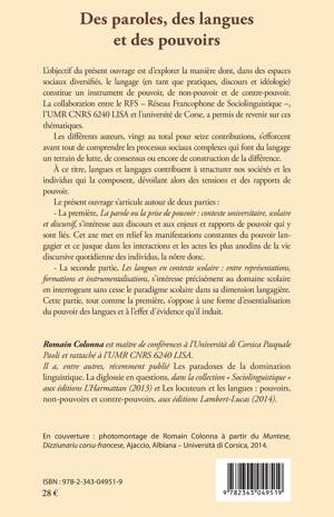 Cet ouvrage explore la manière dont, dans des espaces sociaux diversifiés, le langage constitue un instrument de pouvoir, de non-pouvoir et de contre-pouvoir. Ces contributions s'efforcent de comprendre les processus sociaux complexes qui font du langage un terrain de lutte, de consensus ou encore de construction de la différence. À ce titre, langues et langages contribuent à structurer nos sociétés et les individus qui la composent, dévoilant alors les tensions et des rapports de pouvoir.