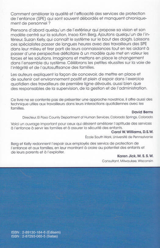 Comment améliorer la qualité et l'efficacité des services de protection de l'enfance (SPE) qui sont souvent débordés et manquent chroniquement de personnel ? Prenons d'abord quelqu'un de l'extérieur qui propose sa vision et son modèle centré sur la solution, Insoo Kim Berg. Ajoutons quelqu'un de l'intérieur, Suzan Kelly, qui connaît le système sur le bout des doigts. Laissons ces spécialistes passer de longues heures avec des travailleurs des SPE dans leur milieu et tirer parti de leurs connaissances tout en les aidant à passer d'une perspective déficitaire à un modèle qui met en valeur les forces et les solutions. Imaginons et mettons en place le changement dans l'ensemble du système. Célébrons les petites réussites sur la voie de l'intégrité et de l'autosuffisance des familles. Les auteurs expliquent la façon de concevoir, de mettre en place et de soutenir cet environnement positif et plein d'espoir dans l'exercice quotidien des travailleurs de première ligne dévoués, aussi bien que des responsables de la supervision, de la gestion et de l'administration. Ce livre ne se contente pas de présenter une approche novatrice, il offre aussi des techniques utiles aux travailleurs dans leurs interactions quotidiennes avec les familles.