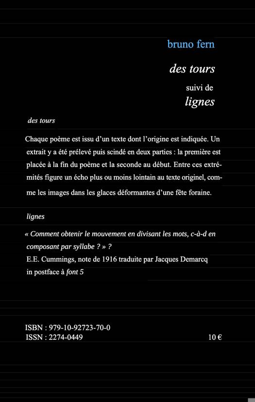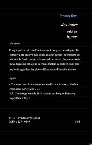 des tours Chaque poème est issu d’un texte où un extrait a été prélevé puis scindé en deux parties : la première est placée à la fin du poème et la seconde au début. Entre ces extrémités figure un écho plus ou moins lointain au texte originel, comme les images dans les glaces déformantes d’une fête foraine. suivi de lignes Une citation (de Guillaume d’Aquitaine à Charles Pennequin en passant par Rimbaud et Apollinaire) a été découpée syllabiquement. Le texte se situe entre chacune de ces syllabes, comme s’il était fait d’excroissances qui s’enchaînent les unes aux autres pour former un ensemble. Les pages sont comme de petites peintures. […] Y entrent, à la fois secs et goguenards, découpés à la hache prosodique, l’obsession sexuelle, le pensif, le décor moderne, une métapoésie désinvolte, des lambeaux de souvenirs. […] Ce serait presque une définition de la… poésie, en fin de compte. Christian Prigent, Zapp & zipp, P.O.L, 2025