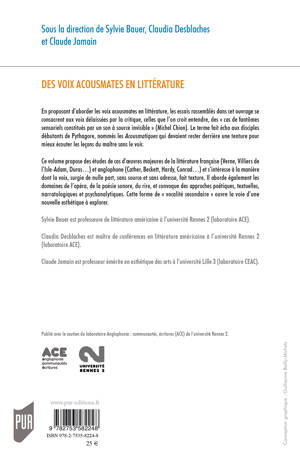 Ce volume propose des études de cas d’oeuvres majeures de la littérature française (Verne, Villiers de l’Isle-Adam, Duras…) et anglophone (Cather, Beckett, Hardy, Conrad…). Il s’intéresse à la manière dont la voix, surgie de nulle part, sans source et sans adresse, fait texture. Il aborde également les domaines de l’opéra, de la poésie sonore et du rire, convoquant des approches poétiques, textuelles, narratologiques et psychanalytiques.