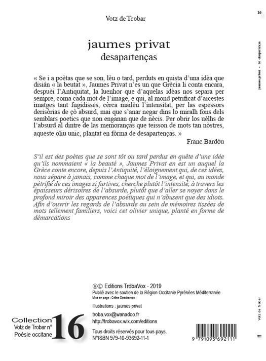 Poèmes en occitan traduits en français Jaumes Privat fut jeté en ce monde dès 1953. Son talent s’affine, depuis lors, se frottant, sans concession, à l’errance de toutes nos futilités verbeuses, nos imbécilités raisonnantes et résonnantes, au fur et à mesure que le vide et l’angoisse les gagne du dedans, parmi les nationaleries, internationaleries et autres occitâneries.