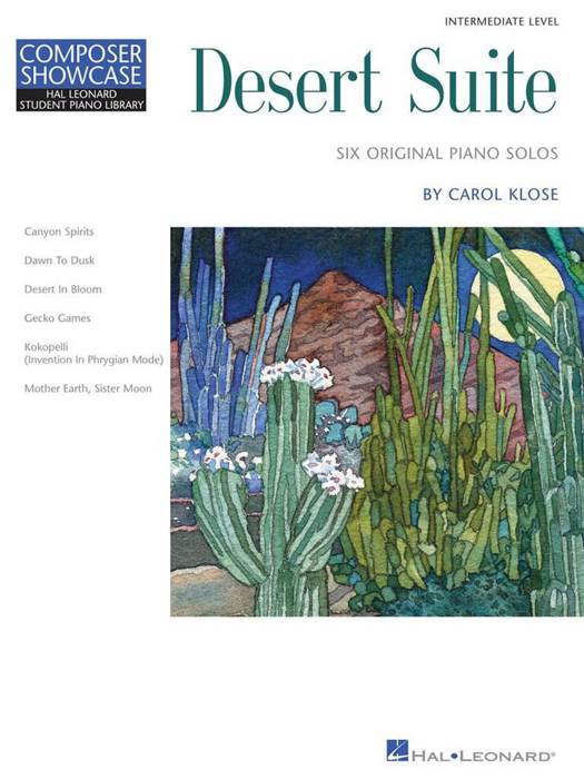 (Educational Piano Library). Impressionistic sonorities blend with hints of Native American flute melodies in this beautiful collection of six solos for the early-intermediate/intermediate-level pianist. Like the images they portray, the pieces are filled with contrast: soaring lyrical melodies interspersed with low earthy motives in open fifths; traditional rhythmic patterns juxtaposed with mixed meters; playful dance-like themes offset by the dark atonal timbres of haunting spirits. Each solo stands alone, but the entire book can also be played in recital as a suite, with tempos that alternate in a pleasing way to create a tightly woven, finely detailed desert landscape. detailed desert landscape. Level: Early-Intermediate/Intermediate (Hal Leonard Student Piano Library Levels 4-5); Range: full grand staff and leger lines; Meters: 2/2, 3/4, 4/4, 7/8; Technical Features: broken chord accompaniments, some double-note intervals in both hands, cross-hand patterns, interlocked hand position, legato pedal, pedal points, multiple textures. Length: 2-5 pages; Average performance time: 2 minutes, 30 seconds. Performance time for entire suite: 10 minutes, 3 seconds. 6 solos: Canyon Spirits * Dawn to Dusk * Desert in Bloom * Gecko Games * Kokopelli (Invention in Phrygian Mode) * Mother Earth, Sister Moon.