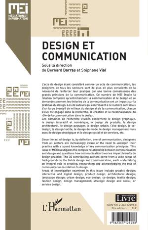 L'acte de design étant considéré comme un acte de communication, les designers de tous les secteurs sont de plus en plus conscients de la nécessité de renforcer leur pratique par une bonne connaissance des grands principes de la communication. Ce numéro de MEI étudie la relation complexe qu'entretiennent la communication et le design et se demande comment les théories de la communication ont un impact sur la pratique du design. Les domaines de recherche étudiés concernent notamment le design graphique, le design interactif et numérique, le design de produits, le design architectural, paysager, urbain, l'éco-design, le co-design, le design textile, le design de mode, le design management mais aussi le design stratégique et le design social et de services...