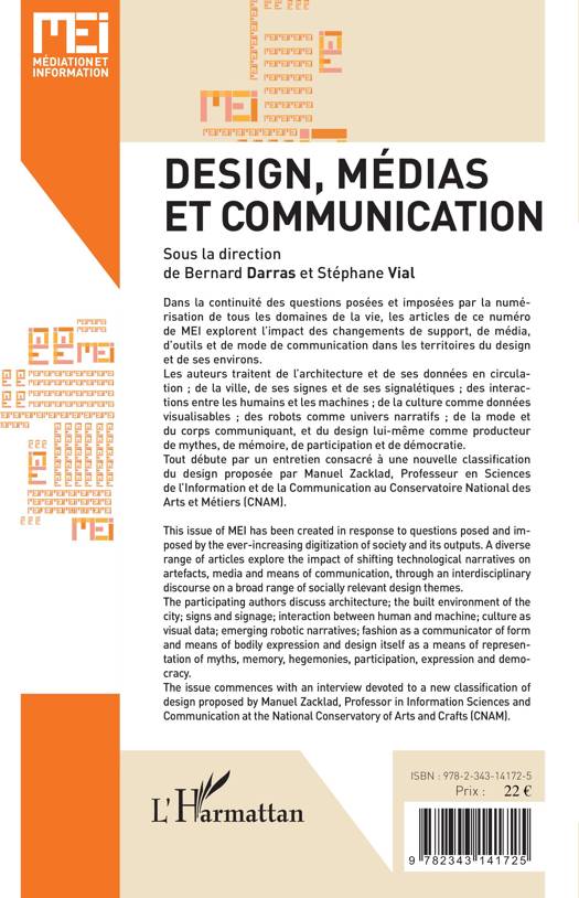 Dans la continuité des questions posées et imposées par la numérisation. Ces articles explorent l'impact des changements de support, de média, d'outils et de mode de communication dans les territoires du design. Les auteurs traitent de l'architecture et de ses données en circulation ; de la ville, de ses signes et de ses signalétiques ; des interactions entre les humains et les machines ; de la culture comme données visualisables ; des robots comme univers narratifs ; de la mode et du corps communiquant, et du design lui-même comme producteur de mythes, de mémoire, de participation et de démocratie.