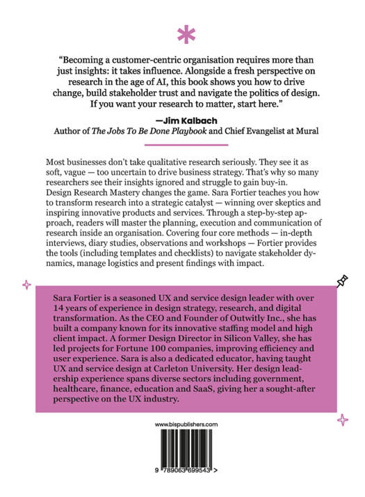 Design Research Mastery changes the game. Sara Fortier teaches you how to transform research into a strategic catalyst-winning over skeptics and inspiring innovative products and services. Through a step-by-step approach, readers will master the planning, execution, and communication of research inside an organization. Covering four core methods-in-depth interviews, observations, diary studies, and workshops-Fortier provides the tools (including templates and checklists) to navigate stakeholder dynamics, manage logistics, and present findings with impact.