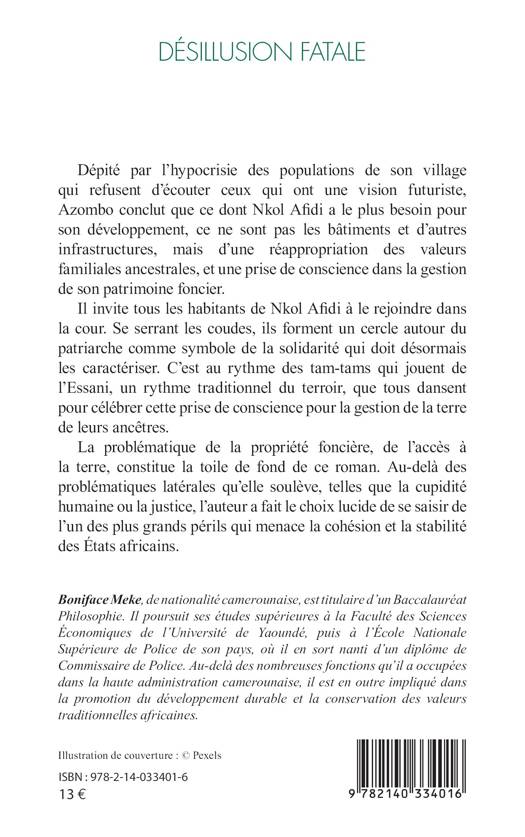 Dépité par l'hypocrisie des populations de son village qui refusent d'écouter ceux qui ont une vision futuriste, Azombo conclut que ce dont Nkol Afidi a le plus besoin pour son développement, ce ne sont pas les bâtiments et d'autres infrastructures, mais d'une réappropriation des valeurs familiales ancestrales, et une prise de conscience dans la gestion de son patrimoine foncier. Il invite tous les habitants de Nkol Afidi à le rejoindre dans la cour. Se serrant les coudes, ils forment un cercle autour du patriarche comme symbole de la solidarité qui doit désormais les caractériser. C'est au rythme des tam-tams qui jouent de l'Essani, un rythme traditionnel du terroir, que tous dansent pour célébrer cette prise de conscience pour la gestion de la terre de leurs ancêtres. La problématique de la propriété foncière, de l'accès à la terre, constitue la toile de fond de ce roman. Au-delà des problématiques latérales qu'elle soulève, telles que la cupidité humaine ou la justice, l'auteur a fait le choix lucide de se saisir de l'un des plus grands périls qui menace la cohésion et la stabilité des États africains.