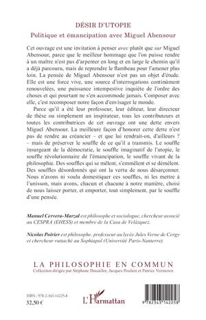 Cet ouvrage est une invitation à penser avec plutôt que sur Miguel Abensour, philosophe de l'utopie. Sa pensée est une force vive, une source d'interrogations continûment renouvelées, une puissance intempestive inquiète de l'ordre des choses et pourtant qui ne s'en accommode jamais. Composer avec elle, c'est recomposer notre façon d'envisager le monde. C'est préserver le souffle de ce qu'il a transmis : le souffle insurgeant de la démocratie, le souffle imaginatif de l'utopie, le souffle révolutionnaire de l'émancipation, le souffle vivant de la philosophie.