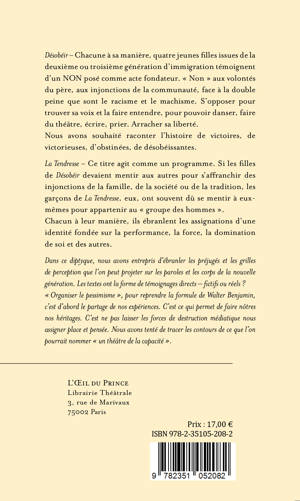 Désobéir - Chacune à sa manière, quatre jeunes filles issues de la deuxième ou troisième génération d'immigration témoignent d'un Non posé comme acte fondateur. « Non » aux volontés du père, aux injonctions de la communauté, face à la double peine que sont le racisme et le machisme. S'opposer pour trouver sa voix et la faire entendre, pour pouvoir danser, faire du théâtre, écrire, prier. Arracher sa liberté.