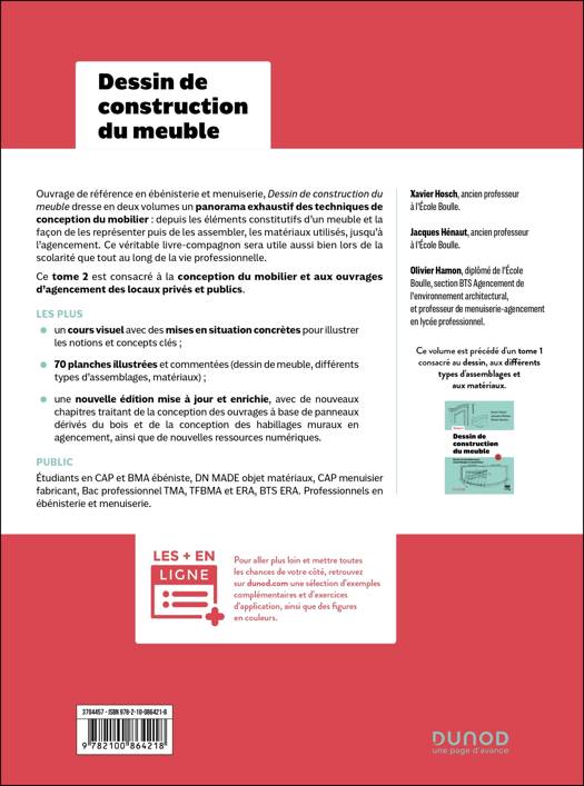 panorama exhaustif des techniques de conception du mobilier : depuis les éléments constitutifs d’un meuble et la façon de les représenter puis de les assembler, les matériaux utilisés, jusqu’à l’agencement. Ce véritable livre-compagnon sera utile aussi bien lors de la scolarité que tout au long de la vie professionnelle.
