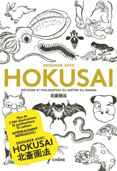 L’intégrale des carnets d’apprentissage d’HokusaiDessiner avec Hokusai réunit dans un format manga plus de 3 000 illustrations issues de 15 livres imprimés sur bois. C’était son oeuvre ultime, servant à « préserver tout ce que j’ai appris », qui présente les grandes compétences de l’auteur en tant que dessinateur, mais le révèle également sous un jour nouveau, en soulignant ses idées et son sens de l’humour atypiques. Ce volume de près de 900 pages montre son approche ludique du dessin avec des images composées de lettres (sorte d’ancêtres des émoji d’aujourd’hui).
