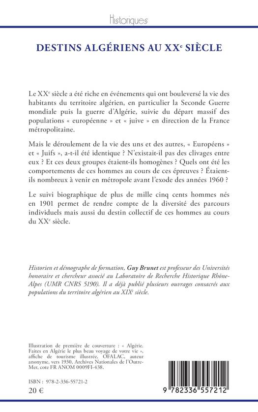 Le XXe siècle a été riche en événements qui ont bouleversé la vie des habitants du territoire algérien, en particulier la Seconde Guerre mondiale puis la guerre d'Algérie, suivie du départ massif des populations européenne et juive en direction de la France métropolitaine. Mais le déroulement de la vie des uns et des autres, Européens et Juifs, a-t-il été identique ? N'existait-il pas des clivages entre eux ? Et ces deux groupes étaient-ils homogènes ? Quels ont été les comportements de ces hommes au cours de ces épreuves ? Étaient-ils nombreux à venir en métropole avant l'exode des années 1960 ? Le suivi biographique de plus de mille cinq cents hommes nés en 1901 permet de rendre compte de la diversité des parcours individuels mais aussi du destin collectif de ces hommes au cours du XXe siècle.