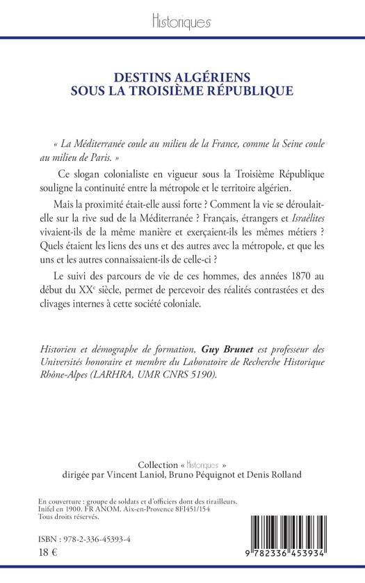 La Méditerranée coule au milieu de la France, comme la Seine coule au milieu de Paris. Ce slogan colonialiste en vigueur sous la Troisième République souligne la continuité entre la métropole et le territoire algérien. Mais la proximité était-elle aussi forte ? Comment la vie se déroulait-elle sur la rive sud de la Méditerranée ? Français, étrangers et Israélites vivaient-ils de la même manière et exerçaient-ils les mêmes métiers ? Quels étaient les liens des uns et des autres avec la métropole, et que les uns et les autres connaissaient-ils de celle-ci ? Le suivi des parcours de vie de ces hommes, des années 1870 au début du XX e siècle, permet de percevoir des réalités contrastées et des clivages internes à cette société coloniale.
