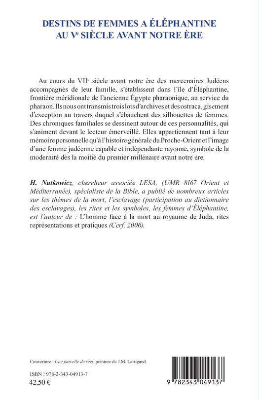 Au cours du VIIè siècle avant notre ère, des membres d'une communauté judéo-araméenne s'installent à Eléphantine, île de Haute-Egypte. Ils laissent une moisson de documents : contrats, lettres, ostraca, listes et récits littéraires, où s'ébauchent des silhouettes de femmes. Des chroniques familiales se dessinent autour de ces personnalités ; elles appartiennent tant à leur mémoire personnelle qu'à l'histoire générale du Proche-Orient et donne l'image d'une femme judéenne capable et indépendante.