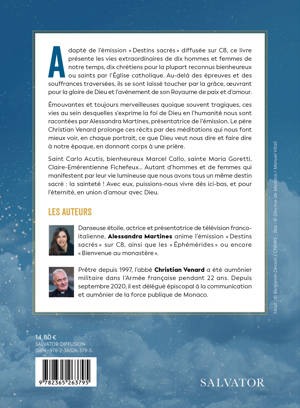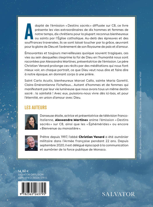 Adapté de l'émission « Destins sacrés » diffusée sur C8, ce livre présente les vies extraordinaires de dix hommes et femmes de notre temps, dix chrétiens pour la plupart reconnus bienheureux ou saints par l'Église catholique. Au-delà des épreuves et des souffrances traversées, ils se sont laissé toucher par la grâce, oeuvrant pour la gloire de Dieu et l'avènement de son Royaume de paix et d'amour. Émouvantes et toujours merveilleuses quoique souvent tragiques, ces vies au sein desquelles s'exprime la foi de Dieu en l'humanité nous sont racontées par Alessandra Martines, présentatrice de l'émission. Le père Christian Venard prolonge ces récits par des méditations qui nous font mieux voir, en chaque portrait, ce que Dieu veut nous dire et faire dire à notre époque, en donnant corps à une prière. Saint Carlo Acutis, bienheureux Marcel Callo, sainte Maria Goretti, Claire-Emérentienne Fichefeuxâ¦