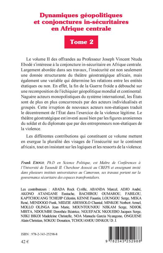 Ce volume II s'intéresse à la conjoncture in-sécuritaire en Afrique centrale. Largement abordée dans ses travaux, l'insécurité est non seulement une donnée structurante du théâtre géostratégique africain, mais également une variable qui détermine les relations entre les entités étatiques ou non. En effet, la fin de la Guerre froide a débouché sur une recomposition de l'échiquier géopolitique mondial et continental. Naguère acteurs monopolistiques du système international, les États sont de plus en plus concurrencés par des acteurs individualisés et groupés. Cette irruption de nouveaux acteurs non-étatiques traduit le décentrement de l'État dans l'exercice de la violence légitime. Le théâtre géostratégique est investi aussi bien par les figures aroniennes du soldat et du diplomate que par des entrepreneurs non-étatiques de la violence. Les différentes contributions qui constituent ce volume mettent en exergue la pluralité des visages de l'insécurité sur le continent africain, tout en insistant sur les logiques et les ressorts de la violence.