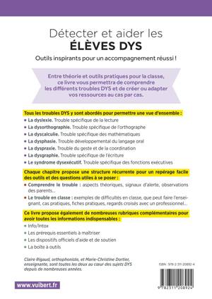 Ce livre s’adresse aux professeurs des écoles, stagiaires, débutants mais aussi aux enseignants expérimentés, désireux de trouver les clés indispensables pour accompagner les élèves qui présentent des troubles dys dans leurs apprentissages de la maternelle et de l'élémentaire.