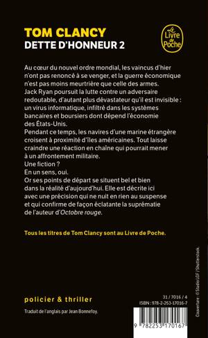 Au coeur du nouvel ordre mondial, les vaincus d'hier n'ont pas renoncé à se venger. Et la guerre économique n'est pas moins meurtrière que l'autre. Jack Ryan poursuit ici la lutte contre un adversaire redoutable, d'autant plus dévastateur qu'il est invisible: un virus informatique, infiltré au coeur des systèmes bancaires et boursiers dont dépend l'économie des États-Unis. Cependant, les navires d'une marine étrangère croisent à proximité d'îles américaines. Et tout laisse craindre une réaction en chaîne qui pourrait mener à un affrontement non plus seulement économique, mais militaire. Scénario de politique-fiction ? En un sens, oui. Mais dont les points de départ se situent bel et bien dans les réalités économiques, financières, technologiques d'aujourd'hui, décrites ici avec une précision qui ne nuit en rien au suspense. Et qui confirme de façon éclatante la suprématie de l'auteur d'Octobre rouge et de La Somme de toutes les peurs.