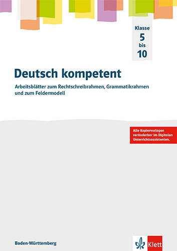 Der Kopiervorlagenband von Deutsch kompetent speziell für Baden-Württemberg bietet ergänzend zu den Schulbüchern der Klassen 5-10 vertiefendes Material zu Rechtschreibung und Grammatik an. Einerseits können die Anforderungen des Grammatik- und des Rechtschreibrahmens, die beide den Bildungsplan ergänzenden, damit vollumfänglich erfüllt werden. Andererseits sind die einführenden Materialien zum Feldermodell für die Klassen 5 und 6 der bisherigen Baden-Württemberg-Ausgabe enthalten, die sehr geschätzt wurden. So bleiben sie auch im Zusammenhang der neuen Generation für den Unterricht verfügbar.