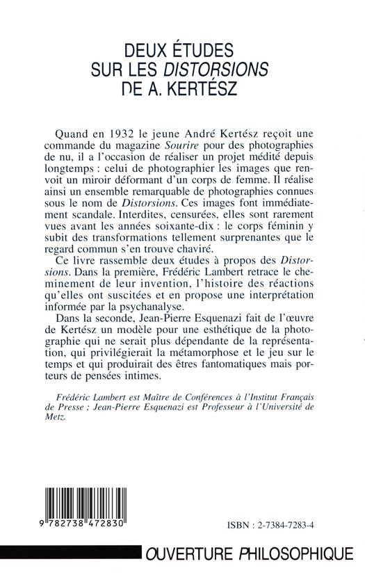 Quand en 1932 le jeune André Kertész reçoit une commande du magazine Sourire pour des photographies de nu, il a l'occasion de réaliser un projet médité depuis longtemps : photographier les images que renvoit un miroir déformant d'un corps de femme. Dans la première étude, Frédéric Lambert propose une interprétation informée par la psychanalyse. Dans la seconde, Jean-Pierre Esquenazi fait de l'uvre de Kertész un modèle pour une esthétique de la photographie qui ne serait plus dépendante de la représentation.