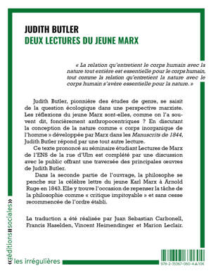 Judith Butler, pionnière des études de genre, se saisit de la question écologique dans une perspective marxiste. Les réflexions du jeune Marx sont-elles, comme on l'a souvent dit, foncièrement anthropocentriques ? En discutant la conception de la nature comme « corps inorganique de l'homme » développée par Marx dans les Manuscrits de 1844, Butler répond par une tout autre lecture. Ce texte prononcé au séminaire étudiant Lectures de Marx de l'ENS est complété par une discussion avec le public offrant une traversée des principales oeuvres de Butler.Dans la seconde partie de l'ouvrage, la philosophe se penche sur la célèbre lettre du jeune Marx à Arnold Ruge en 1843. Elle y trouve l'occasion de repenser la tâche de la philosophie comme «critique impitoyable» et sans cesse recommencée de l'ordre établi.