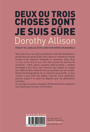 Autrice de "Peau", recueil d'essais devenu culte, Dorothy Allison a grandi dans le sud des États-Unis, dans un contexte de misère sociale et de violences familiales et sexuelles. Dans "Deux ou trois choses dont je suis sûre", elle raconte les femmes de sa famille - mère, soeurs, cousines, filles et tantes -, rendant hommage à leur force, leur humour, leur beauté et surtout leur détermination obstinée face au quotidien qui les accable. Illustré de photographies de sa collection personnelle, ce livre montre à quel point les petites histoires d'une génération peuvent acquérir le statut de légende pour les générations suivantes. Un ouvrage où la vision singulière de Dorothy Allison s'exprime avec beaucoup d'humour et d'émotion.