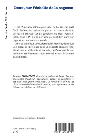 Lors d'une ascension alpine, Abel se blesse. Cet arrêt forcé devient l'occasion de porter, en haute altitude, un regard critique sur sa condition de Haut Potentiel Intellectuel (HPI) qui le perturbe au quotidien dans son rapport aux autres et au monde. Abel se cherche. Il tente, par tous les moyens, de trouver une place, sa libre place dans une société consumériste, abrutissante, aliénante et normée, où l'anormal, le non ordinaire est incompris, non accepté et n'a finalement pas sa place.
