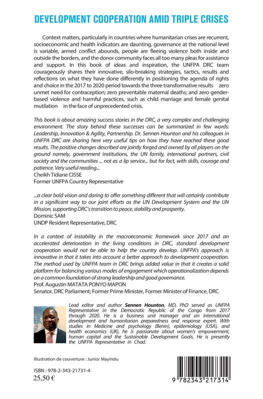 Context matters, particularly in countries where humanitarian crises are recurrent, socioeconomic and health indicators are daunting, governance at the national level is variable, armed conflict abounds, people are fleeing violence both inside and outside the borders, and the donor community faces all too many pleas for assistance and support. In this book, the UNFPA DRC team courageously shares their innovative, silo-breaking strategies, tactics, results and reflections on what they have done differently in positioning the agenda of rights and choice in the 2017 to 2020 period towards the three transformative results zero unmet need for contraception; zero preventable maternal deaths; and zero genderbased violence and harmful practices, such as child marriage and female genital mutilation in the face of unprecedented crisis.