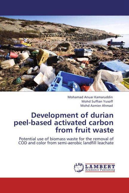 The management of solid waste continues to be a leading challenge in developing country like Malaysia. Rapid urbanization and industrialization has changed the characteristics of solid waste generated. Typically, leachate represents the water which passes through the waste from precipitation from the waste within the landfill site, resulting in a liquid containing suspended solid and soluble components of the waste from the degradation of the waste by macro-organisms. In common observation, leachate migrates through the pores available within the mass and drains away in drainage layer. To date, knowledge on the development and use of activated carbon from fruit waste such as durian peel for leachate treatment has not been established and documented yet. Therefore, the ability of durian peel-based activated carbon was tested for the removal of COD and colour from semi-aerobic landfill leachate by adsorption process. Optimum variable conditions were determined using response surface method. The removal pattern of the leachate were investigated by batch adsorption test. Isotherm and kinetic model were employed to determine the adsorption characteristic of the prepared sample.