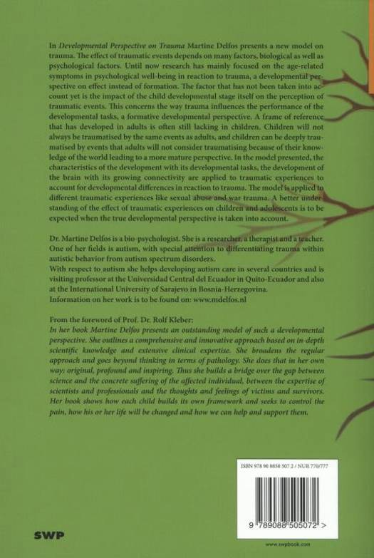 In Developmental Perspective on Trauma Martine Delfos presents a new model on trauma. The effect of traumatic events depends on many factors, biological as well as psychological factors. Until now research has mainly focused on the age-related symptoms in psychological well-being in reaction to trauma, a developmental perspective on effect instead of formation. The factor that has not been taken into account yet is the impact of the child developmental stage itself on the perception of traumatic events. This concerns the way trauma influences the performance of the developmental tasks, a formative developmental perspective. A frame of reference that has developed in adults is often still lacking in children. Children will not always be traumatised by the same events as adults, and children can be deeply traumatised by events that adults will not consider traumatising because of their knowledge of the world leading to a more mature perspective. In the model presented, the characteristics of the development with its developmental tasks, the development of the brain with its growing connectivity are applied to traumatic experiences to account for developmental differences in reaction to trauma. The model is applied to different traumatic experiences like sexual abuse and war trauma.A better understanding of the effect of traumatic experiences on children and adolescents is to be expected when the true developmental perspective is taken into account. This book is part 5 in the Picowo series.