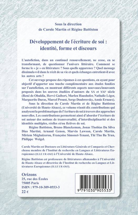 L'autofiction, dans un continuel renouvellement, ne cesse, en se transformant, de questionner l'univers littéraire. Comment se forme le je en littérature ? Sous quelle apparence ? Quel message dissimule-t-il dans le récit de sa vie et quels échanges entretient-il avec les autres arts ? Cet ouvrage propose des réponses à ces questions, en ayant pour objectif d'apporter une touche complémentaire aux études fondées sur l'autofiction, en montrant différents aspects nouveaux/innovants proposés dans les oeuvres étudiées d'auteurs du XX et XXIe siècle (René de Obaldia, Hervé Guibert, Marlen Haushofer, Nathalie Léger, Marguerite Duras, Marcel Proust, Serge Doubrovsky, Annie Ernaux). Sous la direction de Carole Martin et de Régine Battiston (Université de Haute-Alsace), ce volume réunit dix contributions qui analysent la problématique de l'écriture de soi à travers des approches nouvelles. Les contributions permettent ainsi d'aborder l'écriture de soi autour des notions de transversalité, d'interdisciplinarité et des identités multiples, réelles et/ou fictives de soi. Régine Battiston, Bruno Blanckeman, Jonas Thobias Da Silva Dias Martini, Arnaud Genon, Marvin Lawson, Carole Martin, Miriem Méghaïzerou, Françoise Simonet-Tenant, Thi Thu Ba Tran, Philippe Weigel.