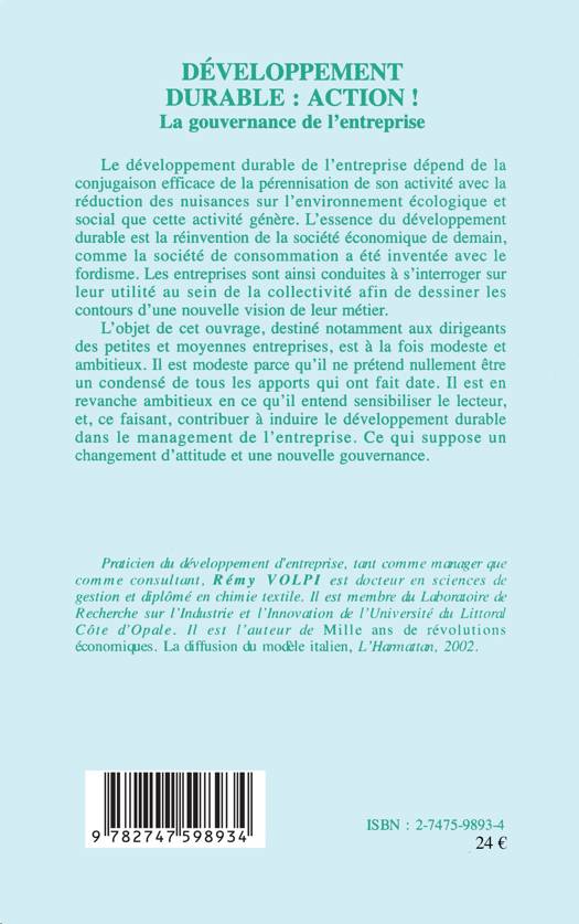 Le développement durable de l'entreprise dépend de la conjugaison efficace de la pérennisation de son activité avec la réduction des nuisances sur l'environnement écologique et social que cette activité génère. L'essence du développement durable est la réinvention de la société économique de demain, comme la société de consommation a été inventée avec le fordisme. Les entreprises sont ainsi conduites à s'interroger sur leur utilité au sein de la collectivité afin de dessiner les contours d'une nouvelle vision de leur métier.