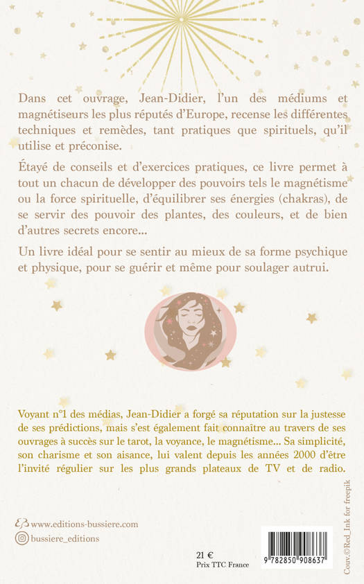 Dans cet ouvrage, Jean-Didier, l'un des médiums et magnétiseur les plus réputés d'Europe, recense les différentes techniques et remèdes, tant pratiques que spirituels, qu'il utilise et préconise. Etayé de conseils et d'exercices pratiques, ce livre permet à tout un chacun de développer des pouvoirs tels le magnétisme ou la force spirituelle, d'équilibrer ses énergies (chakras), de se servir des pouvoir des plantes, des couleurs, et de bien d'autres secrets encore... Un livre idéal se sentir au mieux de sa forme psychique et physique, pour se guérir et même pour soulager autrui.