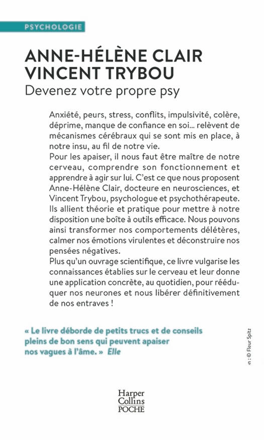 À propos des auteurs Anne-Hélène Clair est docteure en neurosciences, psychologue à l’Institut du cerveau de la Pitié-Salpêtrière (Paris). Vincent Trybou est psychologue et psychothérapeute, spécialisé en thérapies comportementales et cognitives, il exerce au CTAH (Centre des Troubles Anxieux et de l’Humeur).