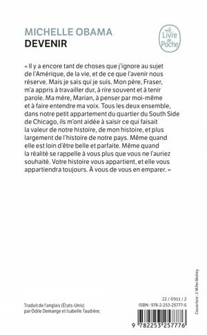 « Il y a encore tant de choses que j'ignore au sujet de l'Amérique, de la vie, et de ce que l'avenir nous réserve. Mais je sais qui je suis. Mon père, Fraser, m'a appris à travailler dur, à rire souvent et à tenir parole. Ma mère, Marian, à penser par moi-même et à faire entendre ma voix. Tous les deux ensemble, dans notre petit appartement du quartier du South Side de Chicago, ils m'ont aidée à saisir ce qui faisait la valeur de notre histoire, de mon histoire, et plus largement de l'histoire de notre pays. Même quand elle est loin d'être belle et parfaite. Même quand la réalité se rappelle à vous plus que vous ne l'auriez souhaité. Votre histoire vous appartient, et elle vous appartiendra toujours. À vous de vous en emparer. »