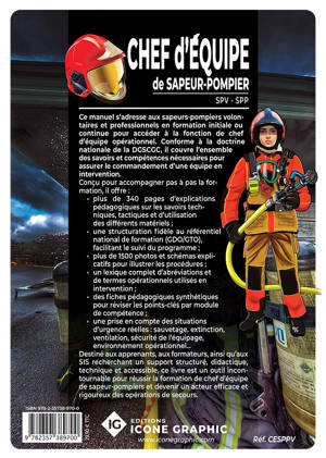 Ce livre informe de façon illustré et didactique les connaissances et procédures nécessaires pour devenir chef d’équipe de sapeur-pompier volontaire ou professionnel. Le chef d’équipe intervient au sein d’une équipe lors des opérations de secours sous l’autorité d’un chef d’agrès. Il intervient dans le cadre de la mission principale de lutte contre l’incendie. Les compétences à acquérir dans le domaine d’activité pour un chef d’équipe sont : de réaliser un sauvetage ou une mise en sécurité, de sécuriser la zone d’intervention, d’éteindre un incendie. Le livre intègre les dernières recommandations des GDO et GTO de la Direction Générale de la Sécurité Civile et de la Gestion des Crises, en conformité avec le RNAC. Avec plus de 1600 photos, illustrations et schémas, l'apprentissage devient ludique et accessible. Chaque notion, chaque technique, chaque geste, est illustré étape par étape sous différentes formes, dans une approche pédagogiques apportant ainsi clarté des textes et accessibilité permettant ainsi au plus grand nombre d'apprendre et se remémorer les gestes et techniques. Ce livre reprend l'intégralité de la formation du chef d'équipe de sapeur-pompier dans près de 340 pages entièrement illustrées. Une version plus synthétique est disponible chez le même éditeur : le mémoscope de l'équipier et chef d'équipe. Un lexique complet d'abréviations spécifiques au chef d'équipe de sapeur-pompier vient ouvrir chaque partie. Essentiel pour pouvoir communiquer et comprendre les termes utilisés par les acteurs du secours.
