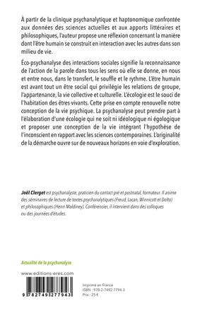 Éco-psychanalyse des interactions sociales signifie la reconnaissance de l’action de la parole dans tous les sens où elle se donne, en nous et entre nous, dans le transfert, le souffle et le rythme. L’être humain est toujours déjà un être social. Ainsi, social concerne les êtres dans leurs relations de groupe, leur vie collective, culturelle, d’appartenance, d’appariement. L’écologie est le souci de l’habitation des êtres vivants. Elle n’intéresse donc pas les seuls êtres humains mais aussi le milieu de vie avec les animaux, les végétaux, les minéraux. Cette prise en compte renouvelle notre conception de la vie psychique. La psychanalyse peut prendre part à l’élaboration d’une écologie qui ne soit ni idéologique ni égologique et proposer une conception de la vie intégrant l’hypothèse de l’inconscient en rapport avec les sciences contemporaines. L’originalité de la démarche ouvre sur de nouveaux horizons en voie d’exploration.