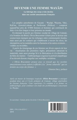 Les peuples autochtones de Guyane - Wayãpi, Wayana, Teko, Kali'na, Arawak-Lokono et Parikwene (Palikur) - comptent aujourd'hui près de 15 000 femmes et hommes qui continuent de faire vivre leur langue et leur présence au monde. En donnant la parole aux femmes wayãpi du village de Camopi, à la frontière du Brésil, Olivia Braconnier éclaire pour le lecteur une cosmovision marquée par les échanges entre communautés locales, mais aussi par les contacts qui s'établissent à travers les rêves, les intempéries ou les maladies entre les humains et les autres existants... visibles ou invisibles. À partir du témoignage de ces femmes sur divers aspects de leur vie - ritualisation des premières règles, précautions entourant la maternité, mais aussi prestige lié à la fabrication et à la distribution de bière de manioc -l'anthropologue esquisse le portrait empathique d'un devenir-femme singulier aux multiples variations.