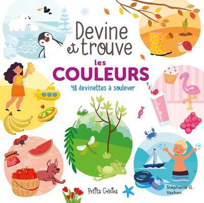 Sauras-tu résoudre les devinettes de ce livre? Lorsque tu auras trouvé la solution, soulève le volet et découvre la réponse! Ensuite, cherche l'élément dans la page. Attention, il se cache parmi d'autres images de la même couleur! Un jeu de devinettes combiné à un cherche et trouve. Voilà un amalgame parfait pour amuser les enfants, tout en développant leur vocabulaire ! À ton tour d'inventer une devinette ! 1. Pense à un mot que tu souhaites faire deviner. 2. Nomme d'abord sa catégorie : une personne, un animal, un objet, un aliment, un moyen de transport... 3. Donne ensuite des indices: sa couleur, sa forme, sa texture, son « bruit », son utilité... 4. Puis fournis la solution.