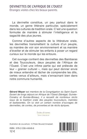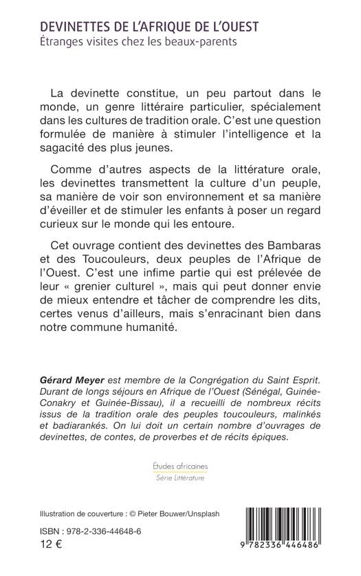 La devinette constitue, un peu partout dans le monde, un genre littéraire particulier, spécialement dans les cultures de tradition orale. C’est une question formulée de manière à stimuler l’intelligence et la sagacité des plus jeunes. Comme d’autres aspects de la littérature orale, les devinettes transmettent la culture d’un peuple, sa manière de voir son environnement et sa manière d’éveiller et de stimuler les enfants à poser un regard curieux sur le monde qui les entoure. Cet ouvrage contient des devinettes des Bambaras et des Toucouleurs, deux peuples de l’Afrique de l’Ouest. C’est une infime partie qui est prélevée de leur « grenier culturel », mais qui peut donner envie de mieux entendre et tâcher de comprendre les dits, certes venus d’ailleurs, mais s’enracinant bien dans notre commune humanité.