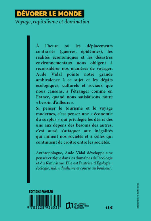 À l'heure où les déplacements contrariés (guerres, épidémies), les réalités économiques et les désastres environnementaux nous obligent à reconsidérer nos manières de voyager, Aude Vidal pointe notre grande ambivalence à ce sujet et les dégâts écologiques, culturels et sociaux que nous causons, à l'étranger comme en France, quand nous satisfaisons notre "besoin d'ailleurs". Si penser le tourisme et le voyage modernes, c'est penser une "économie du surplus" qui privilégie les désirs des uns aux dépens des besoins des autres, c'est aussi s'attaquer aux inégalités qui minent nos sociétés et à celles qui continuent de croître entre les sociétés.