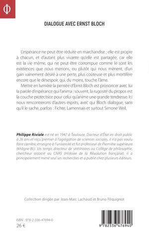L'espérance ne peut être réduite en marchandise; elle est propre à chacun, et d'autant plus vivante qu'elle est partagée, car elle est la vie même, qui ne peut être corrompue comme le sont les existences que nous menons, ou plutôt qui nous mènent, d'un gain vainement désiré à une perte, plus coûteuse et plus mortifère encore que le désespoir, qui, du moins, touche l'âme. Mettre en lumière la pensée d'Ernst Bloch est prononcer avec lui la parole d'espérance qui l'anima; souvent, la rugosité du propos est la couche protectrice pour celui qu'anime une grande tendresse. Ici nous rencontrerons d'autres esprits, avec qui Bloch dialogue, sans qu'il le sache, parfois: Fichte, Lamennais et surtout Simone Weil.