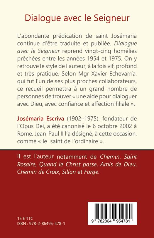 L'abondante prédication de saint Josémaria continue d'être traduite et publiée. Dialogues avec le Seigneur reprend vingt-cinq homélies prêchées entre les ann ées 1954 et 1975. On y retrouve le style qui caractérisait le fondateur de l'Opus Dei, à la fois vif, profond et très pratique. Selon les mots de Mgr Xavier Echevarria, qui fut l'un de ses plus proches collaborateurs, ce recueil permettra à un grand nombre de personnes de trouver « une aide pour dialoguer avec Dieu, avec confiance et affection filiale ».