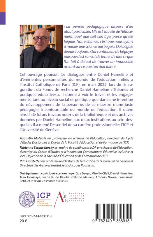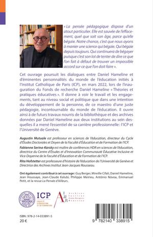 La pensée pédagogique dispose d'un atout particulier. Elle est sauvée de l'effacement, quel que soit son âge, parce qu'elle bégaie. Notre chance, c'est que nous ayons à manier une science qui bégaie. Qui bégaie depuis toujours. Qui continuera de bégayer puisque c'est son lot de tenter de dire ce que l'on fait à défaut de trouver un impossible accord sur ce que l'on doit faire . Cet ouvrage poursuit les dialogues entre Daniel Hameline et d'éminentes personnalités du monde de l'éducation initiés à l'Institut Catholique de Paris (ICP), en mars 2022, lors de l'inauguration du Fonds de recherche Daniel Hameline Théories et pratiques éducatives . Il donne à voir le travail et les engagements, tant au niveau social et politique que dans une intention du développement de la personne, de ce maestro d'une juste pédagogie, incontournable du monde de l'éducation. Il ouvre ainsi à de futurs travaux nourris de la bibliothèque et des archives données par Daniel Hameline aux deux institutions au sein desquelles il a mené l'essentiel de sa carrière professionnelle: l'ICP et l'Université de Genève.